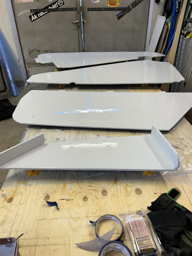 En durk fick först en enklare lagning med lite epoxi och glasfiber då plywooden spruckit. Allt kunde göras i ett varmt garage. Undersidan där det inte är något slitage, målades med kölsvinsfärg som är billigare. Översidorna fick två strykningar.