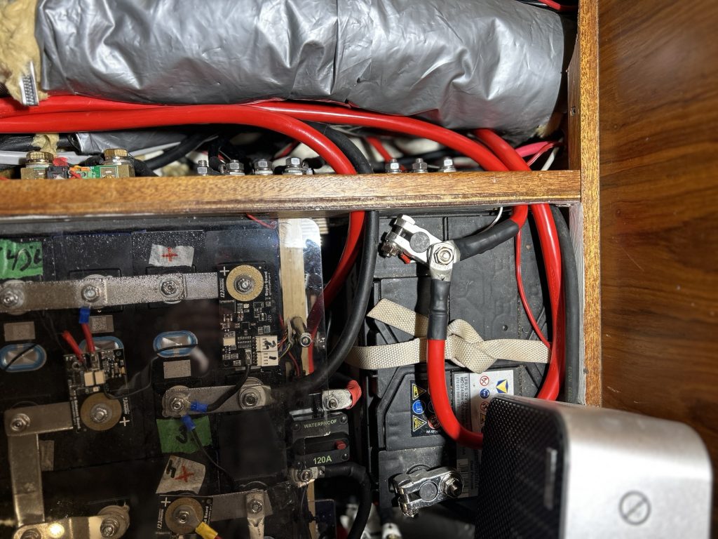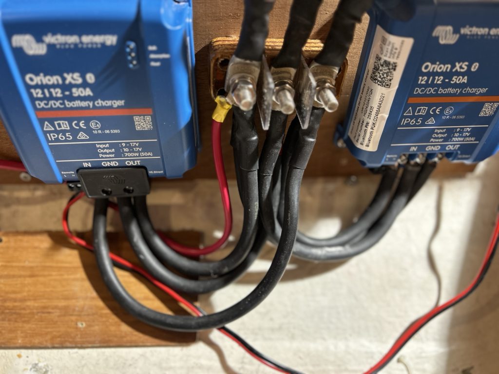 DC/DC har tyvärr lite klena anslutningar som max klarar 25mm2 enligt spec. Jag får bara in 16mm2 men om man tar bort några kardeler från en 25mm2 så går det. Alla kablar går via en fördelningsplint.