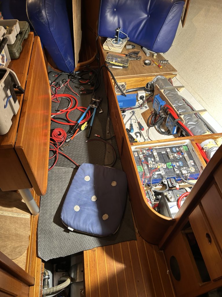 Jag hade i höstas utökat laddningen av batterierna till som mest 100A vilket också kräver lite grövre kablar. Minus kabeln mellan batterier och motor går inne i basinredningen och jag hade räknat med mycket jobb att få dit en grövre. Detta gick emellertid mycket lätt när jag skarvade den nya med den gamla och lyckades dra och skjuta i en 50mm2 kabel.