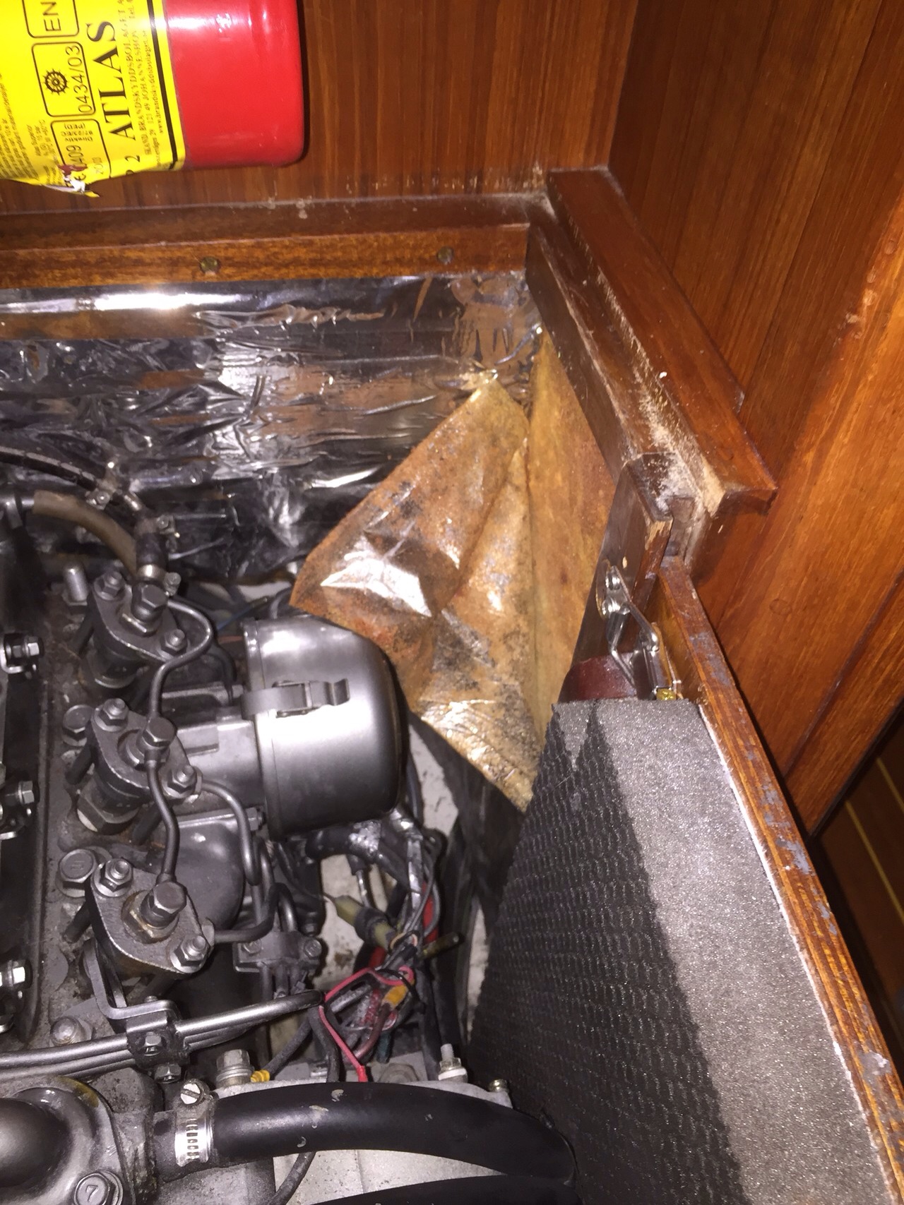 Isoleringen i motorrummet hade börjat lossna och falla sönder. Folien satt endast kvar på något ställe.