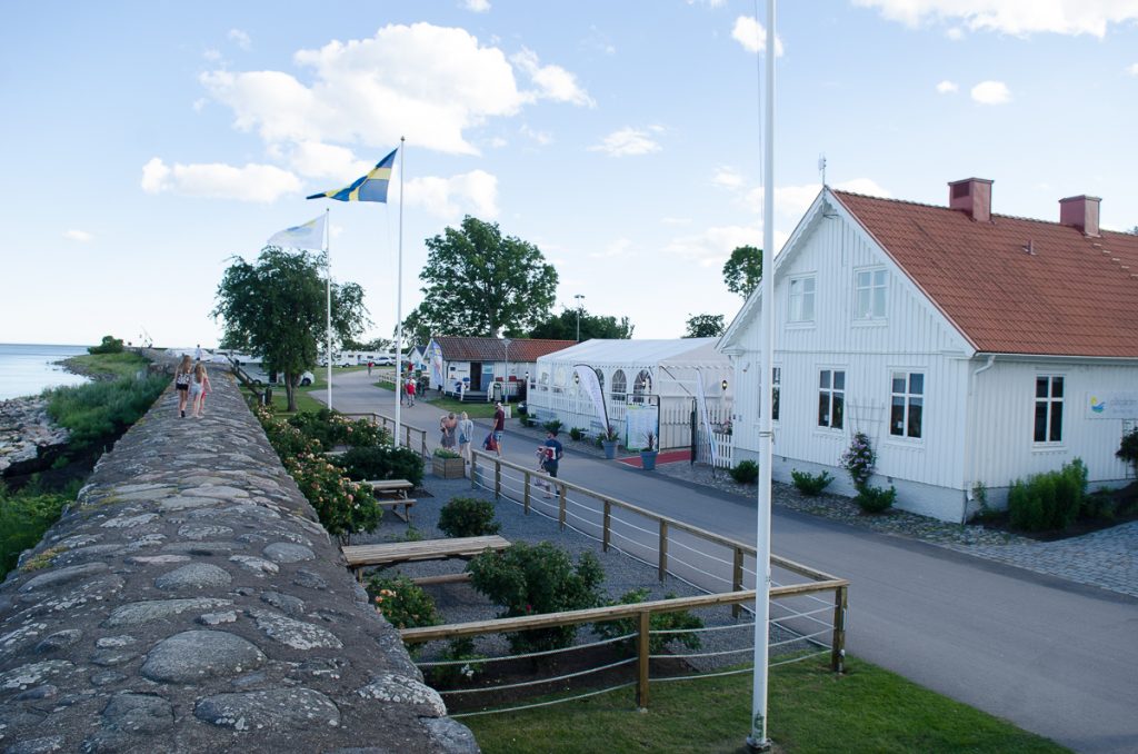 Gästhamnen i Furusund var fullbelagd och något skvallpig, dessutom hade regn utlovats till lördagen så vi hade redan bestämt att vi skulle ta oss till Lidö. När vi kom dit var det nästan mörkt och så fullt på bryggan att vi inte ville trassla oss in till den i mörkret, så vi svajade i viken under natten för att på morgonen hitta en lucka där vi kunde ligga bra. Vi tog förstås en liten promenad, tittade till ångbåtsbryggan och åt varsin glass innan det var dags att sätta upp kapellet och låta regnet smattra..