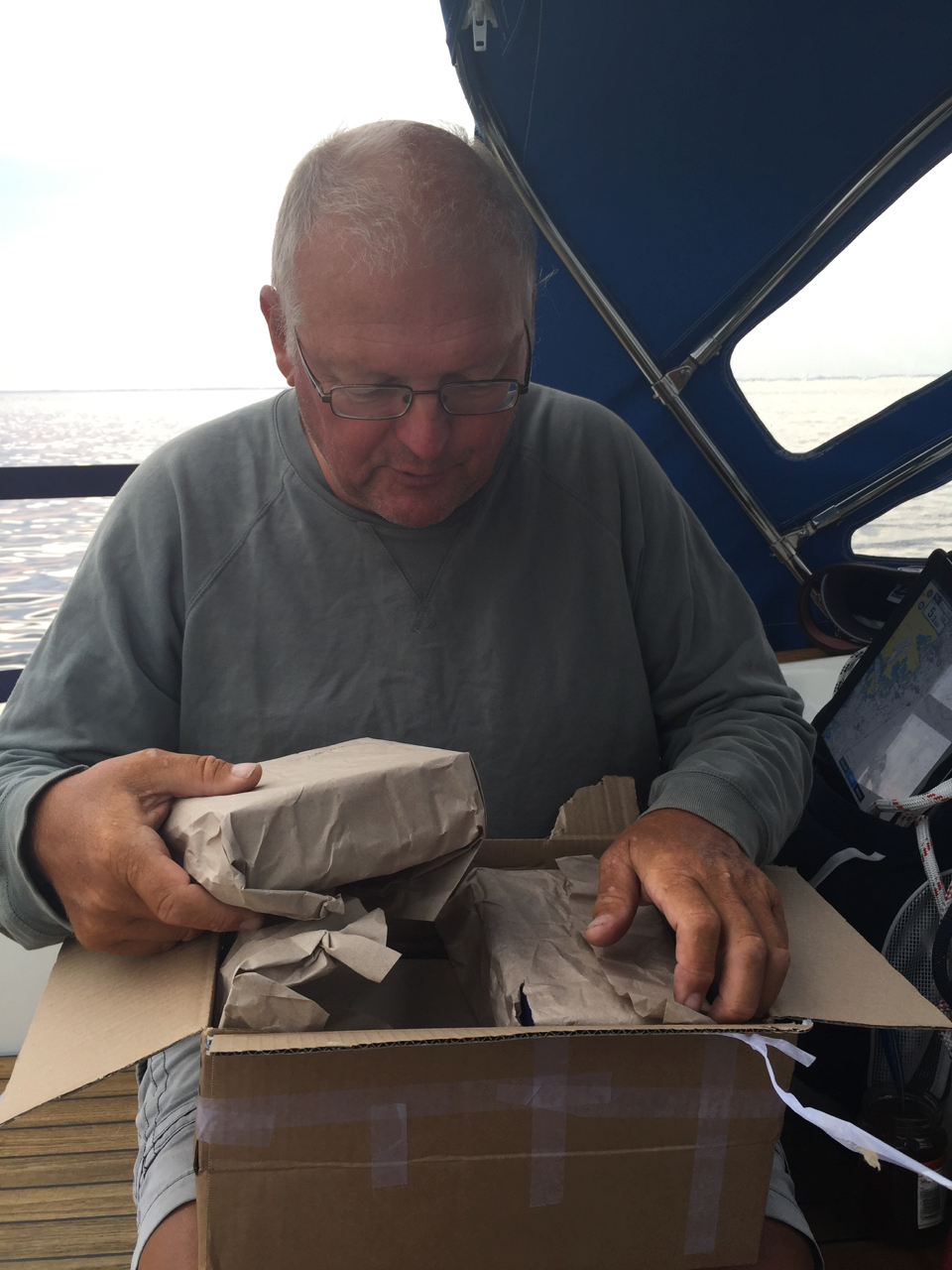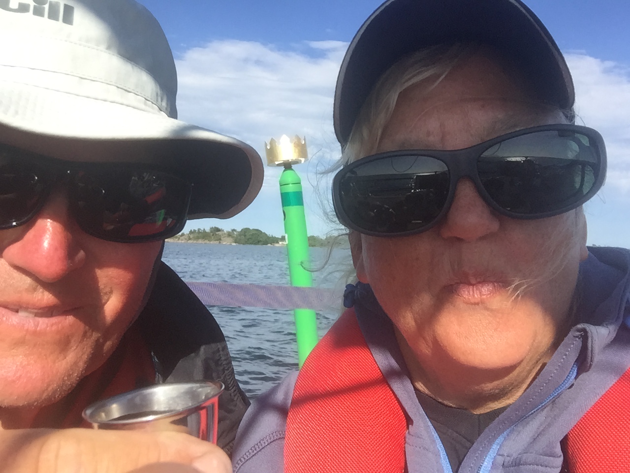 Att åka Eckeröfärjan börjar med att stå i kö- först för att få gå ombord och sen för att få ett bord ( om man tänkt äta) vi fick dela bord med ett trevlig par från Åkersberga… På hemvägen besökte vi taxfreebutiken, det var vi inte ensamma om och därför fick vi stå i kö igen innan vi kunde packa vår pirra och ställa oss i kön för att gå av båten… När vi kom tillbaka till vår egen båt kastade vi loss och åkte tillbaka till Väddö kanal där vi svajankrade i lä bakom en ö över natten.