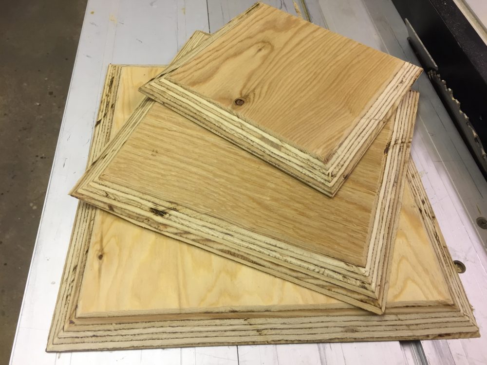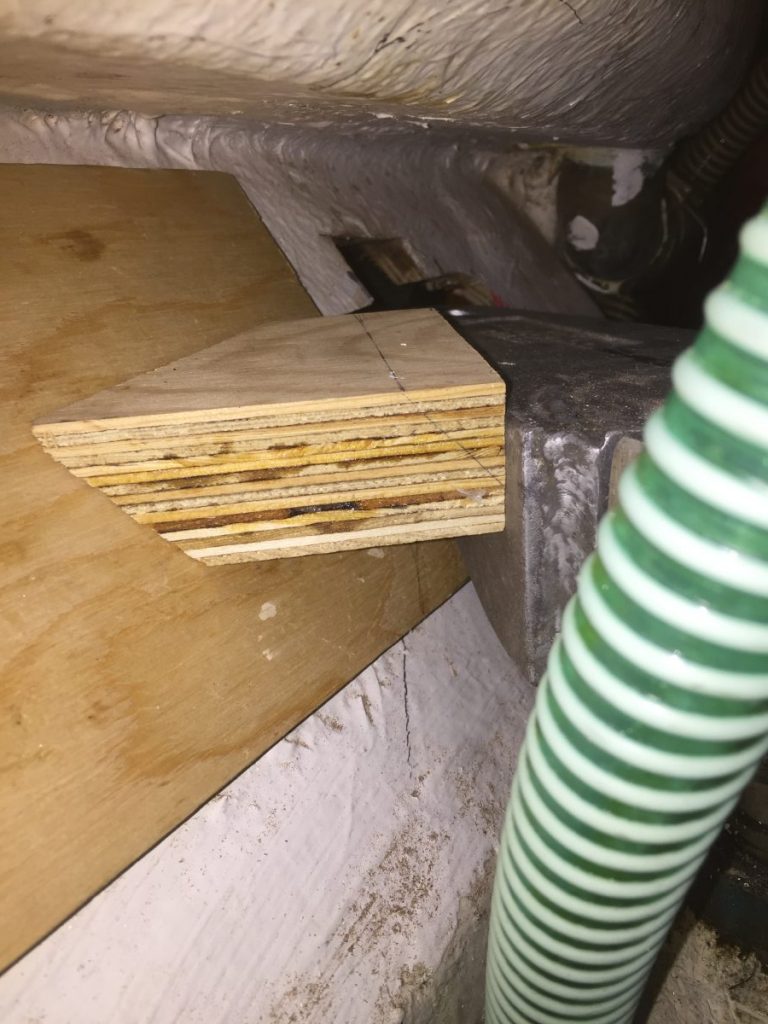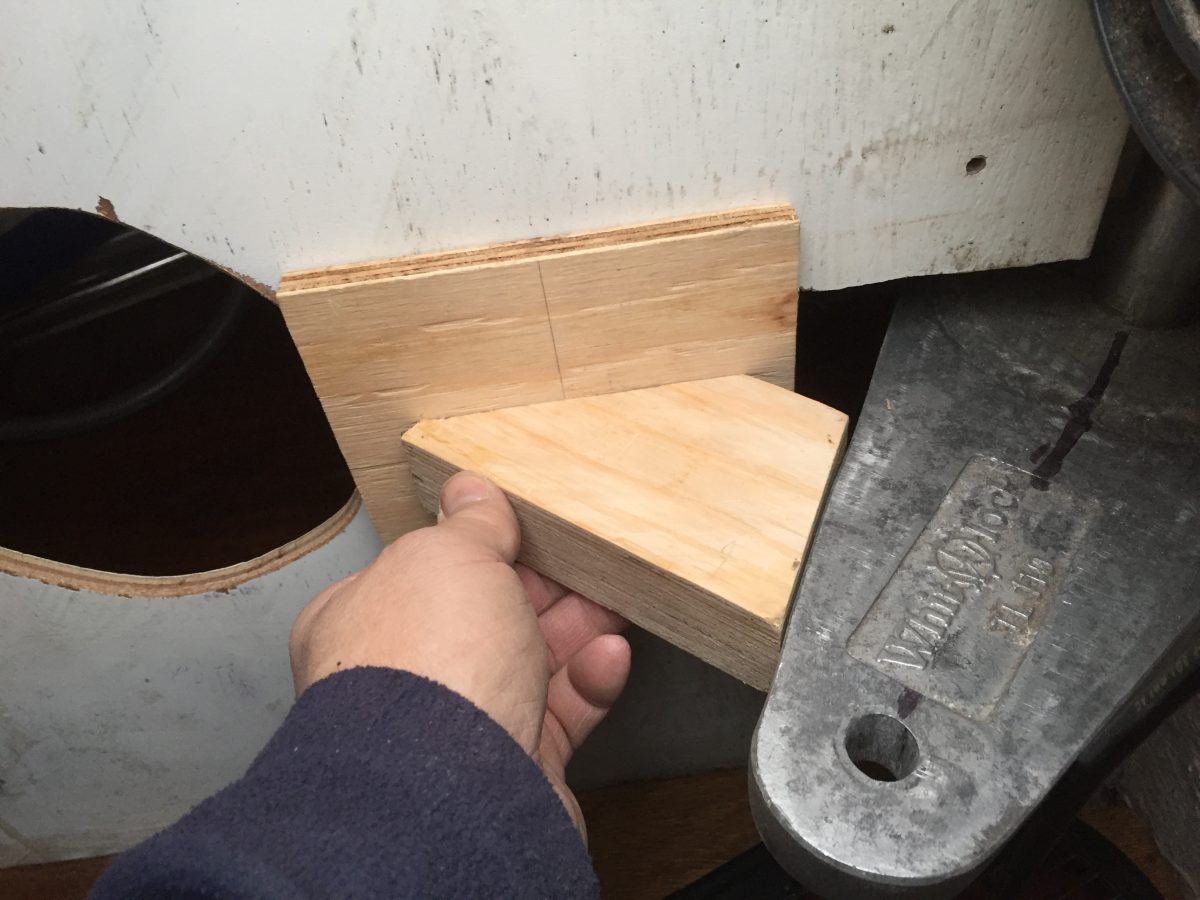 Bättre vore om det fasta fästet kommer ut lite. En plywod-konstruktion kunde ju bli både förstärkning och distans. Så jag sågar till tre delar med fasade kanter…