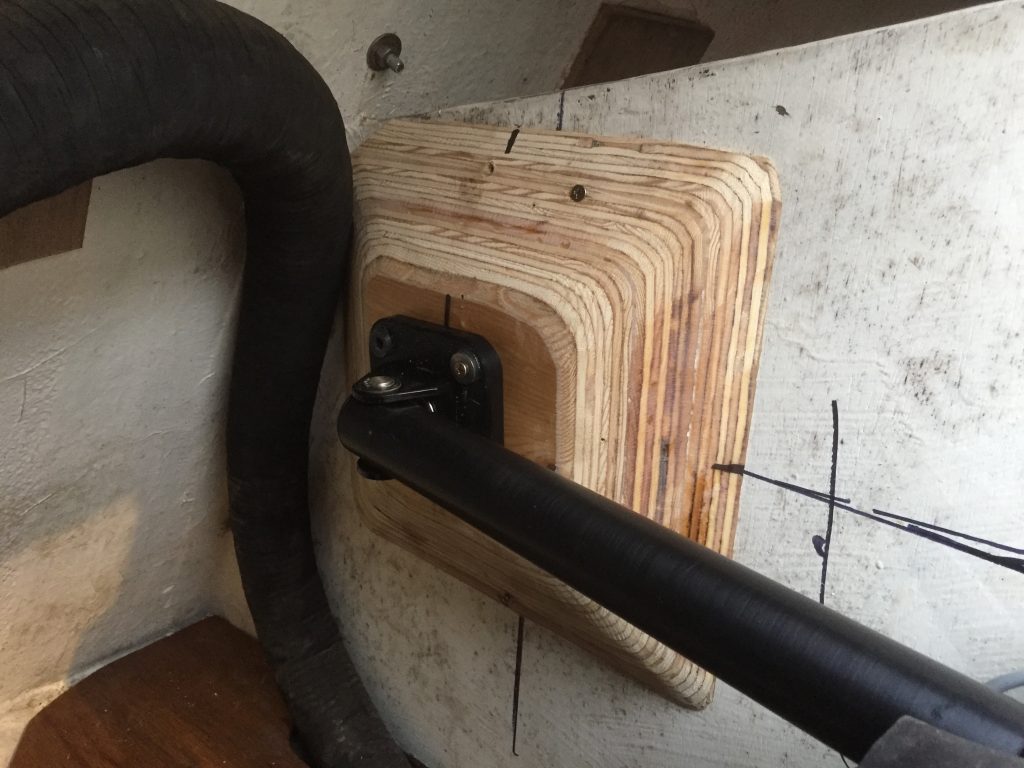 Jag funderade över detta med autopiloten under flera dagar. Rosättra har gjort ett fint beslag som sitter under själva rorkulten där man lägger på autopiloten. Då kan man fälla upp rorkulten så den inte är i vägen i sittbrunnen.