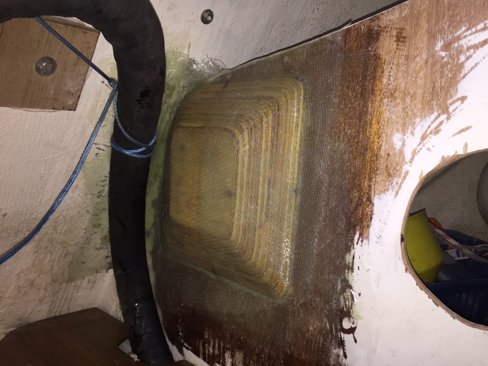 När jag bestämt mig så limmar jag först plywooddistansen med epoxy mot ett renslipat skott. Efter några dagars härdning är det dags att plasta över det hela med glasfiber som går in en bit på akterspegeln.