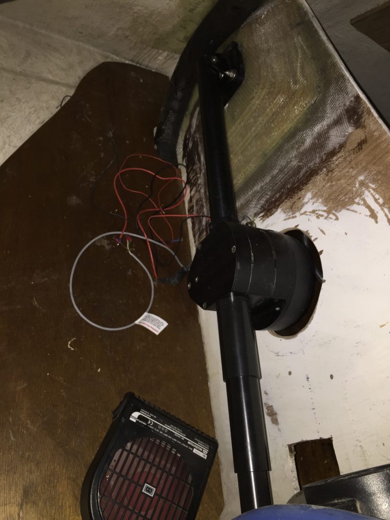 Jag prov-monterar med ett par plåtskruvar i skottet bara för att få en uppfattning om hur det kan bli. Jag inser att det vore bättre att vända motorns runda del in mot skottet. Men då kan det behövas ett hål i skottet så motordelen kan komma in där.