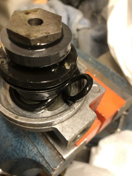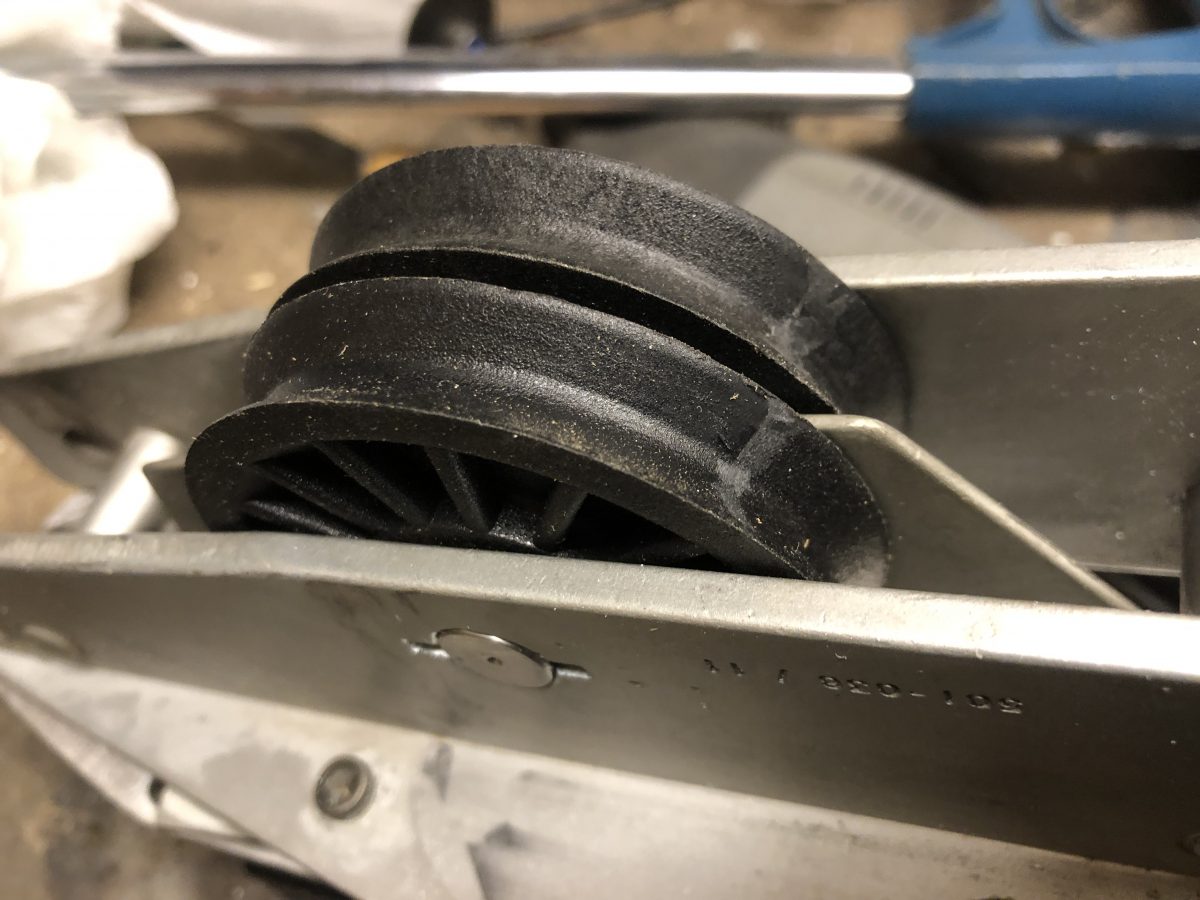 När masttoppsbeslaget var loss så var det ju lika bra att kontrollera trissorna för storfallen. Det såg ut som en ”rörsprint” satt genom hålet och lagrade trissorna. Sprinten satt inte helt i hålet på ena sidan och gick lätt att trycka ut med fingerkraft. Det visade sig när den kom ut att den spruckit på längden.