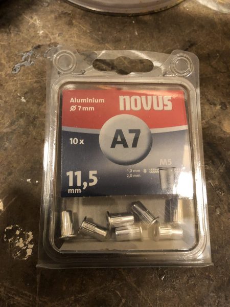 Jag har dock ingen tång för att dra fast dessa och det kändes onödigt att köpa en för endast 4 nitar så jag provade en egen metod att expandera niten genom att mot-dra en mutter.