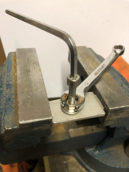 Jag började med att borra upp hålet i mastbeslaget till 12mm från tidigare 10mm. Därefter borrade jag ett 2,2 mm hål i riggbultens ände, tvärs befintligt hål för saxpinnen. Därför att det hålet var 3,5 och för stort.