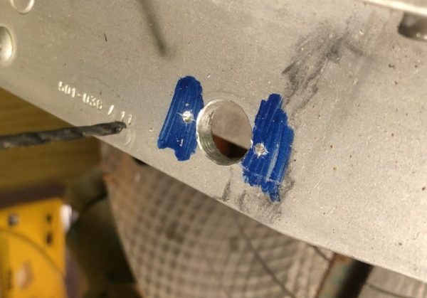 Detta skulle nog fungera. Jag borrade upp befintliga hål i masten till 7mm och började med de två nedre hålen. Den första gick bra. Den andra drog inte ordentligt men skulle nog fungera. När jag borrade det tredje hålet stötte jag på patrull. Det fanns något bakom som hindrade borr och nit. Masttoppsbeslaget stack ner just där och det skulle inte finnas plats för en nitmutter.