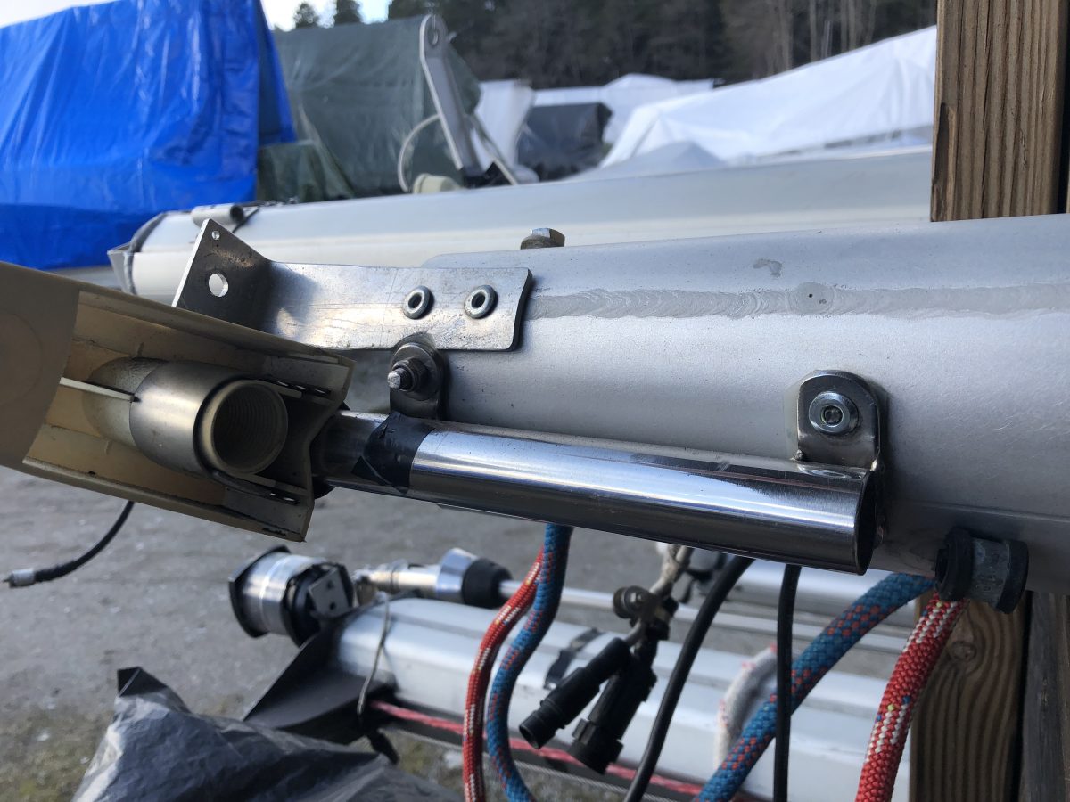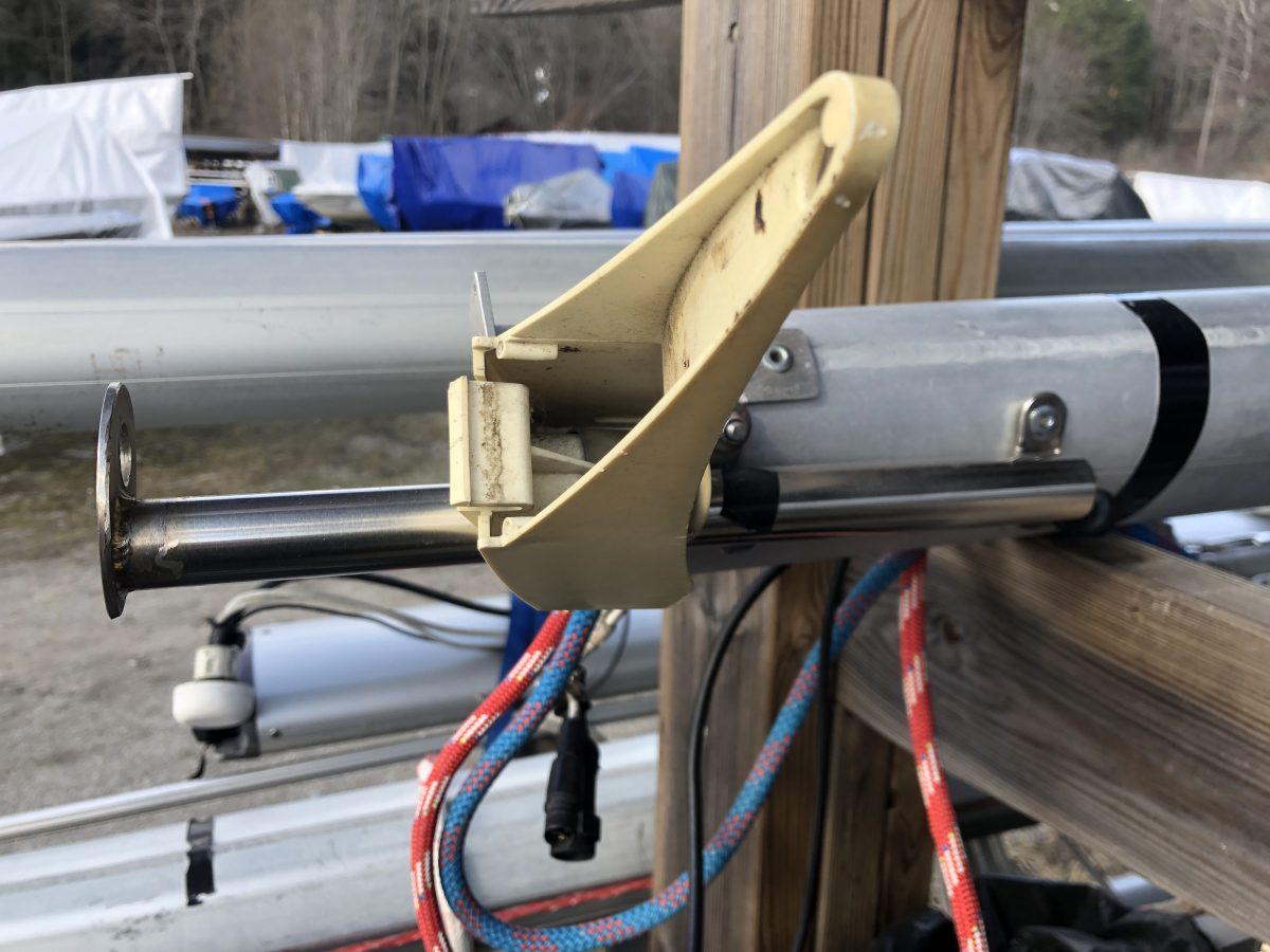 Detta beslag tar jag bort under vintern när masten ligger i mastskjulet. Skruvhålen för plåtskruvarna har blivit sämre och sämre och skruvarna sitter inte riktigt hårt. Oroande då inget i masttoppen får lossna under säsong/segling eftersom det är svårt att åtgärda.