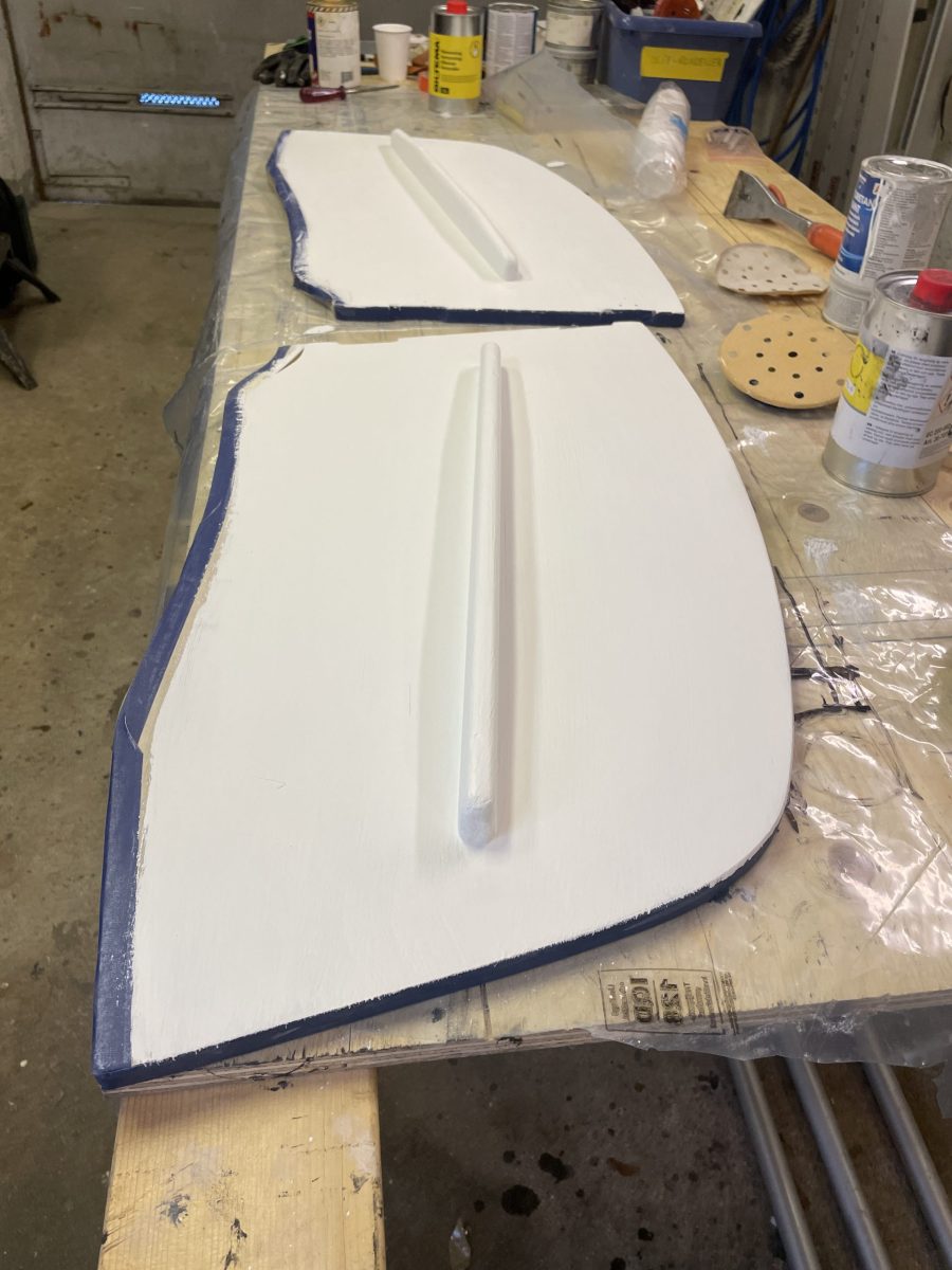 Jag bestämde mig då för att måla undersidorna vita. Med polurethanlack. Det visade sig inte så lätt att få tag i Polyurethanlack. Biltema hade en bra sådan men den har utgått. Internationals Perfektion säljs inte längre till privatpersoner (om jag fattat rätt). Kvar finns Epifanes för ca 900:-/burk. Jag lyckades hitta några restburkar på SeaSea i Täby men bara i grått. Det fick bli så.