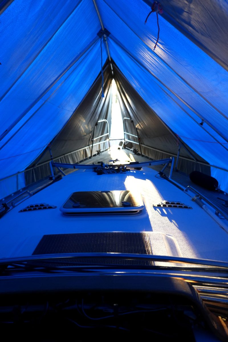 Vi fick fort upp tältet och kunde sitta och kura med kuddar och filtar medan regnet öste ner och vinden tjöt i masterna. Kapten blev bjuden på lunch i restaurangen och vi gick till rökeriet och köpte lax, både gravad och rökt samt inlagd strömming som är bra att ha till lunch.