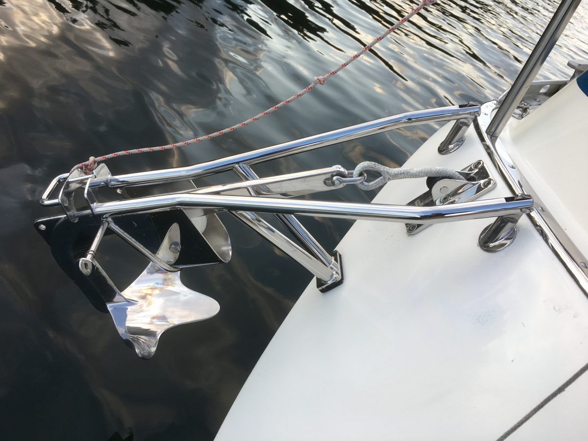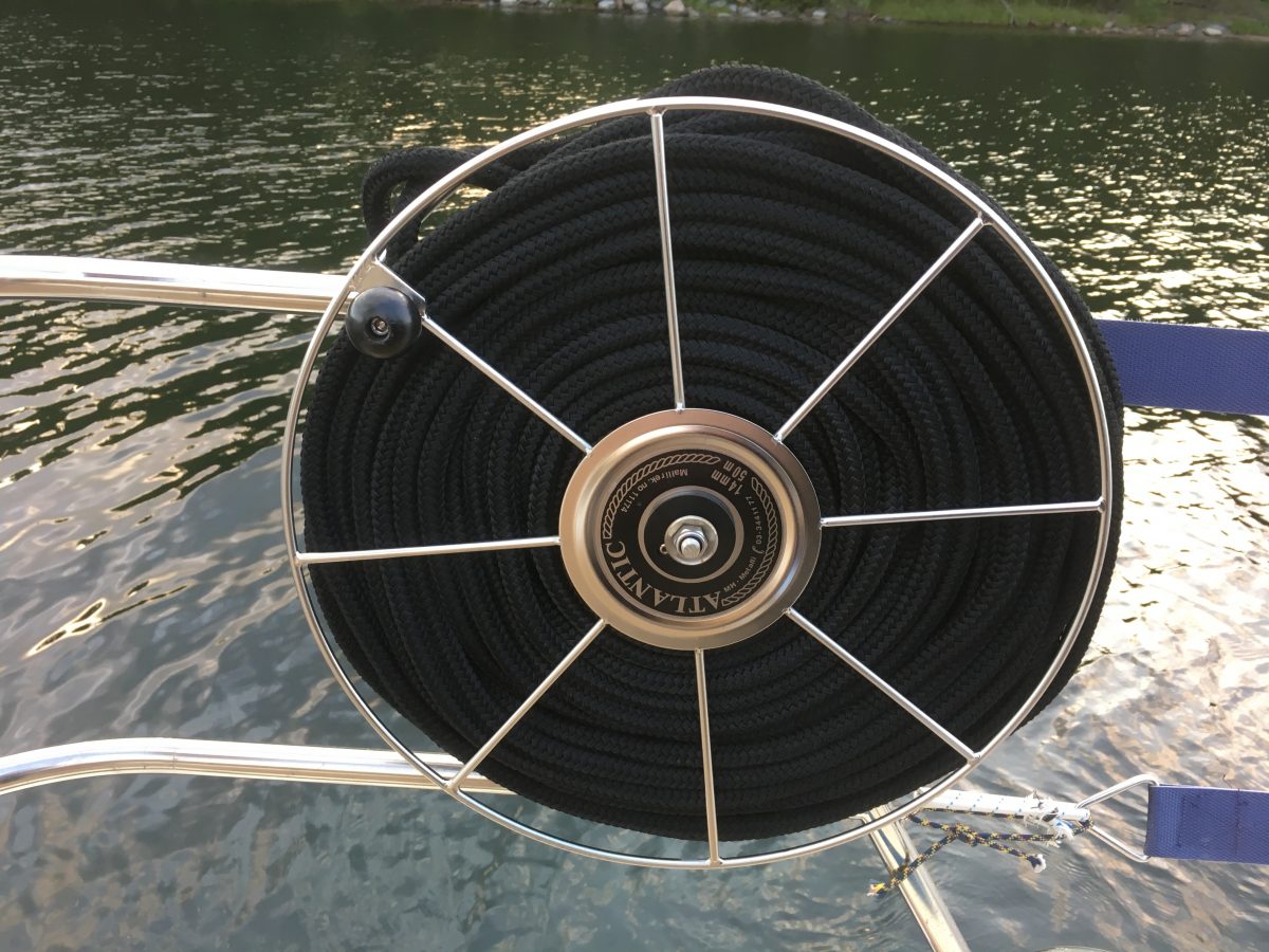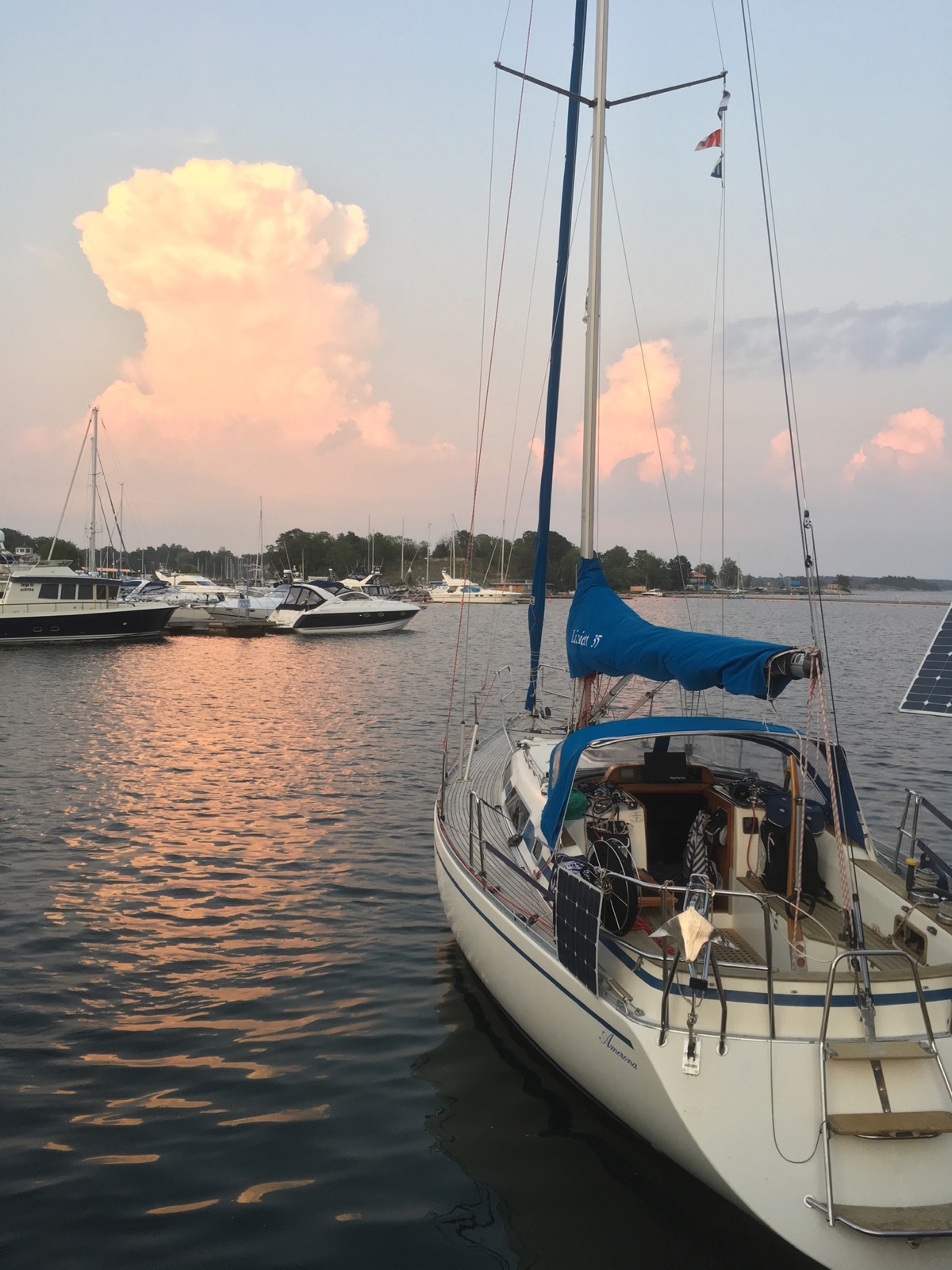 Enligt skyltarna hade den gamla gästhamnen nu bara uthyrda platser men där låg några båtar som vi uppfattade som gäster. Vi begav oss mot den nya delen av hamnen där det fanns ett antal y-bommar för förtöjning för två båtar mellan varje. Vinden låg på in i hamnen så vi ville ligga på läsidan om en sådan bom. Allt var förberett med flera förtöjningslinor då vi backade in mot bommen för att få vinden snett framifrån. Men det gick inte som vi tänkt. Midskeppslinan kinkar och kommer fel när Ewa slår fast den i knapen i bommen. Vi hamnar diagonalt mellan bommarna och det krävs en lång stund av förhalning med långa linor. Besättningen i den danska båten intill rör inte en fena för att hjälpa till utan sitter bara, antagligen roade, i sittbrunnen och tittar på.