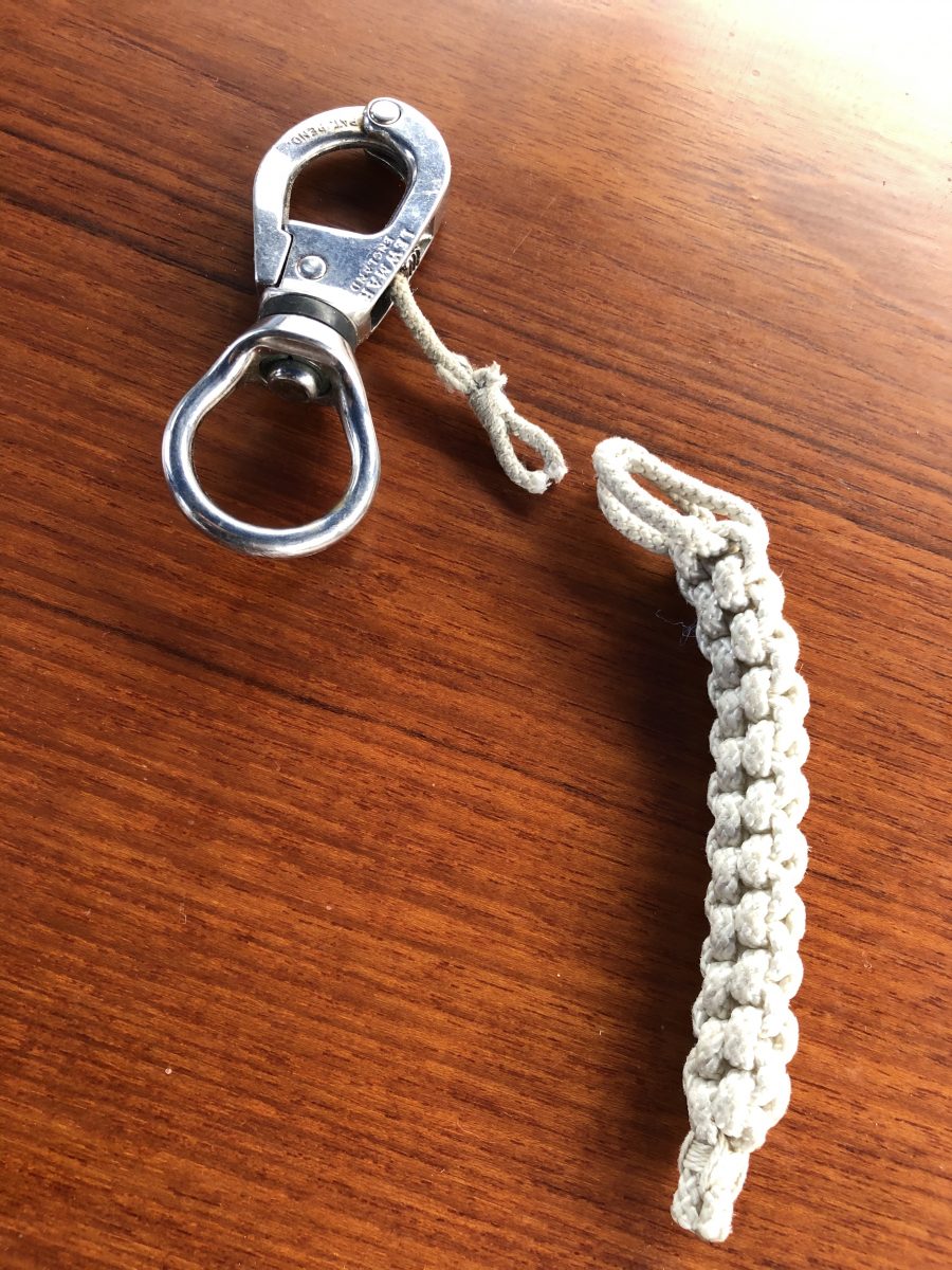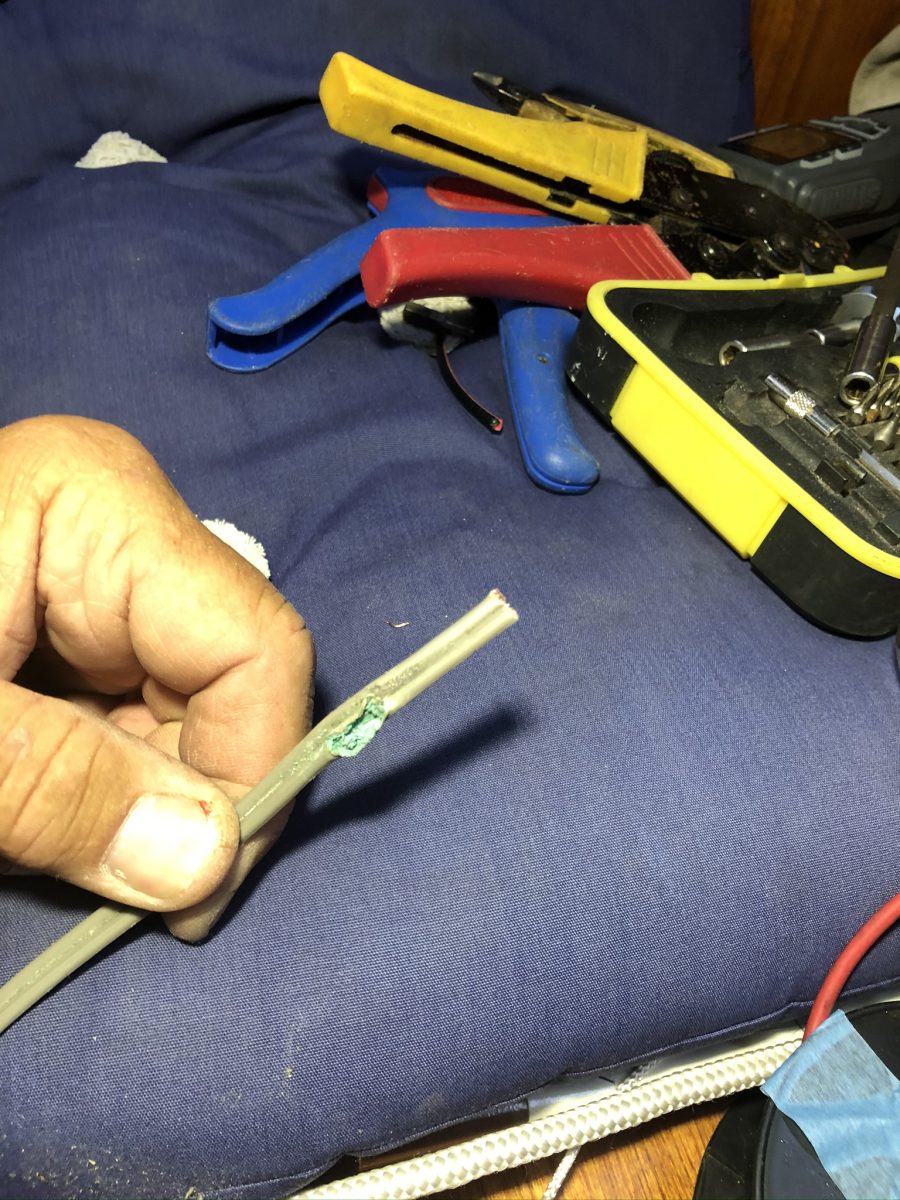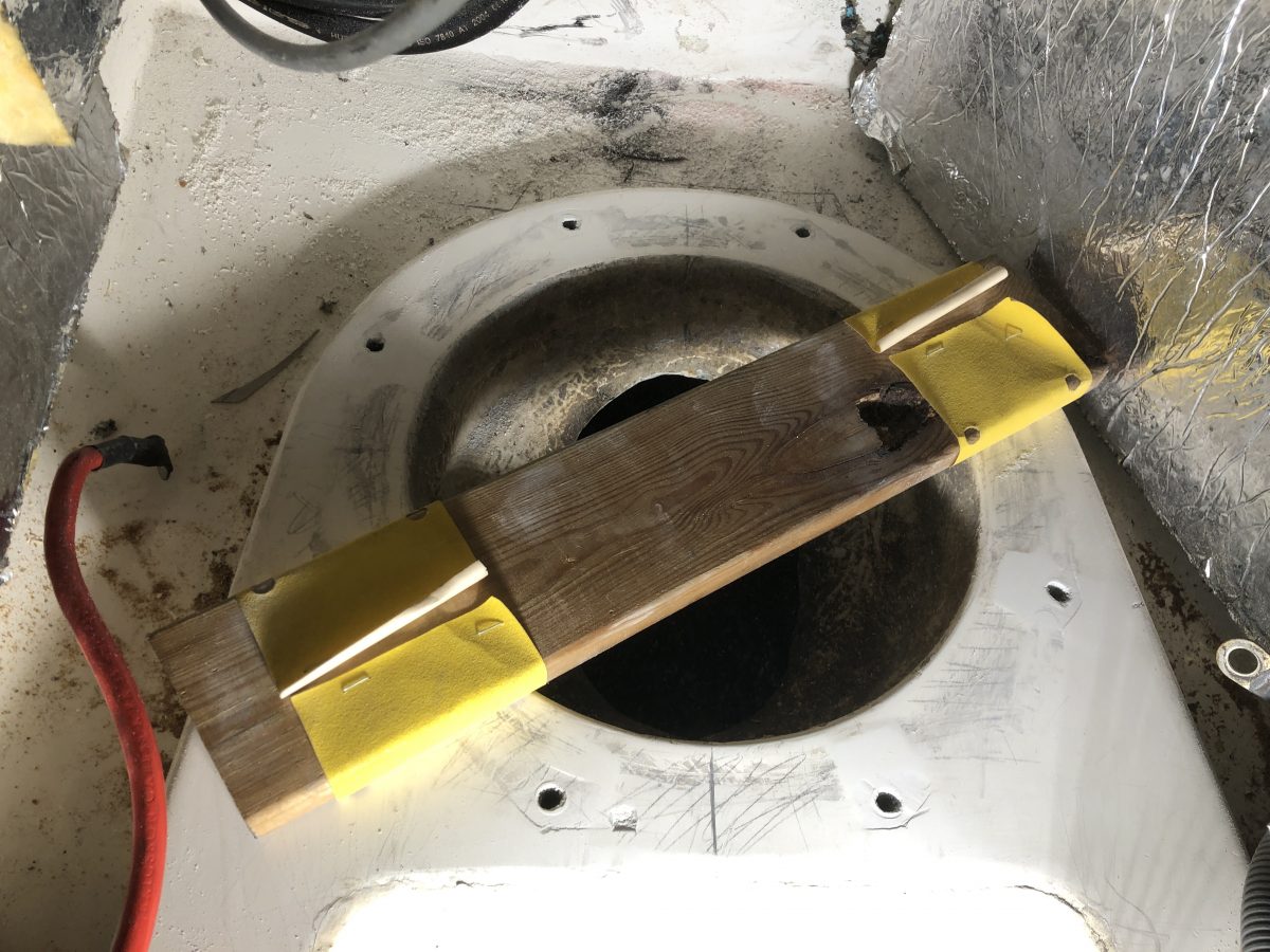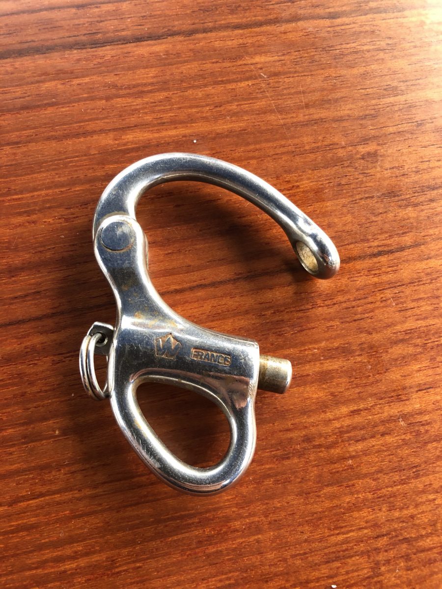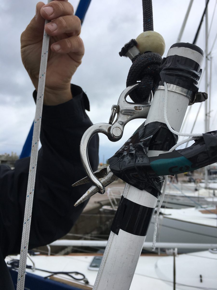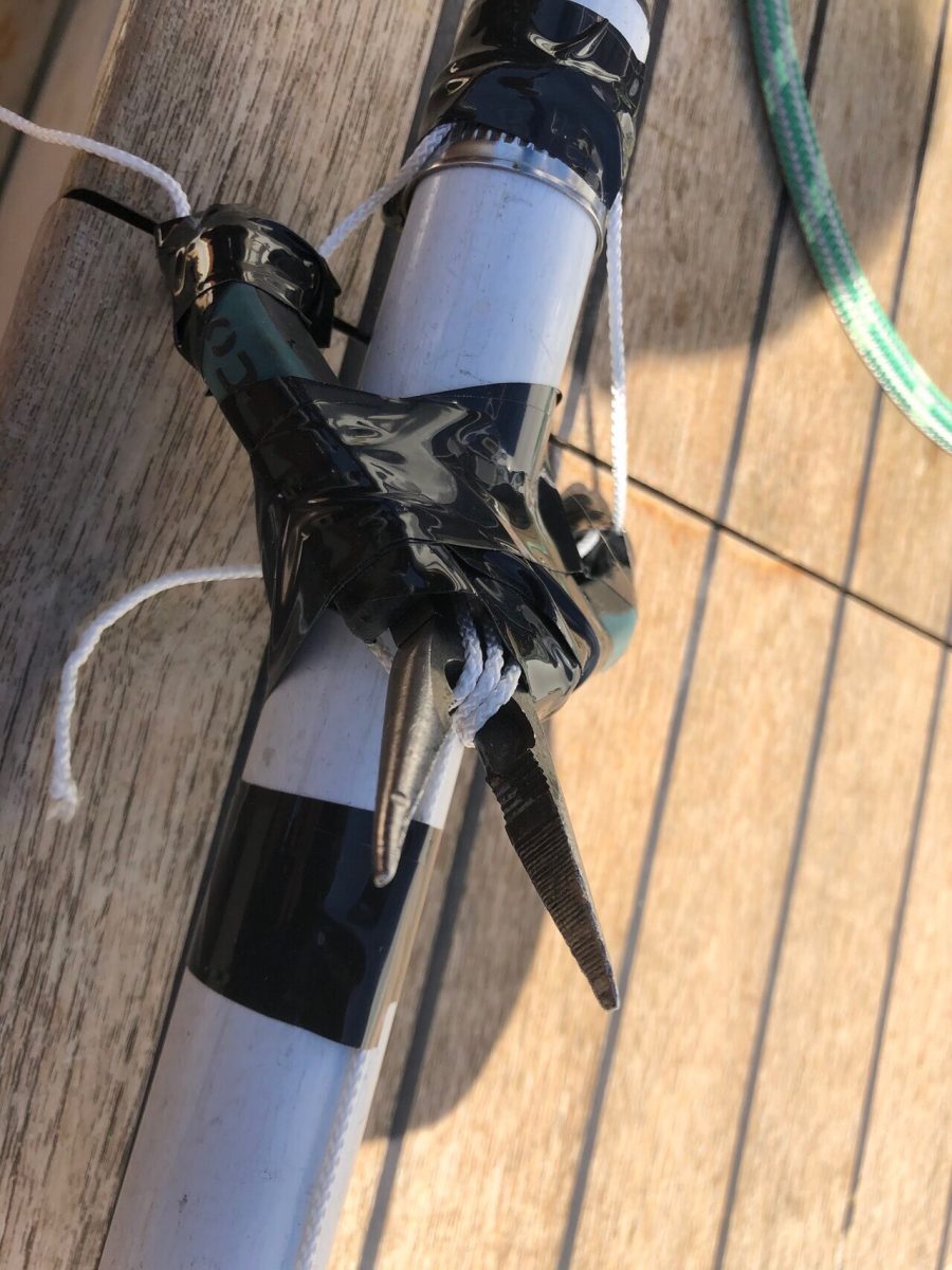 När masttoppsbeslaget var loss så var det ju lika bra att kontrollera trissorna för storfallen. Det såg ut som en ”rörsprint” satt genom hålet och lagrade trissorna. Sprinten satt inte helt i hålet på ena sidan och gick lätt att trycka ut med fingerkraft. Det visade sig när den kom ut att den spruckit på längden.