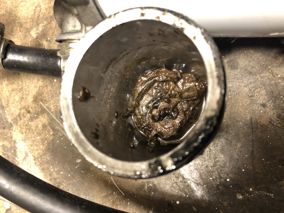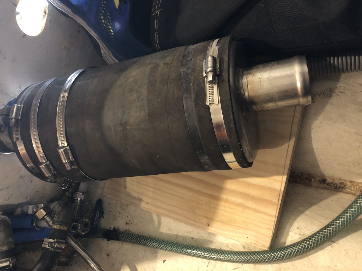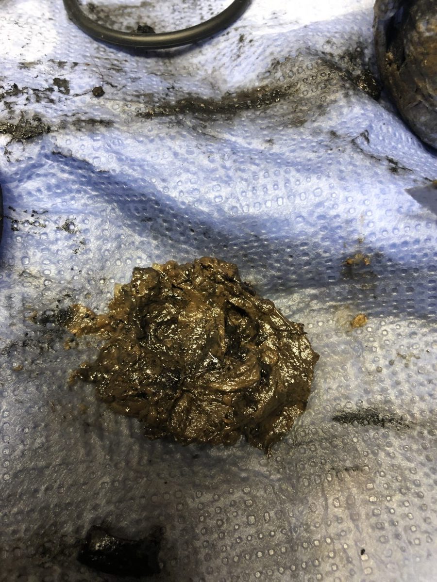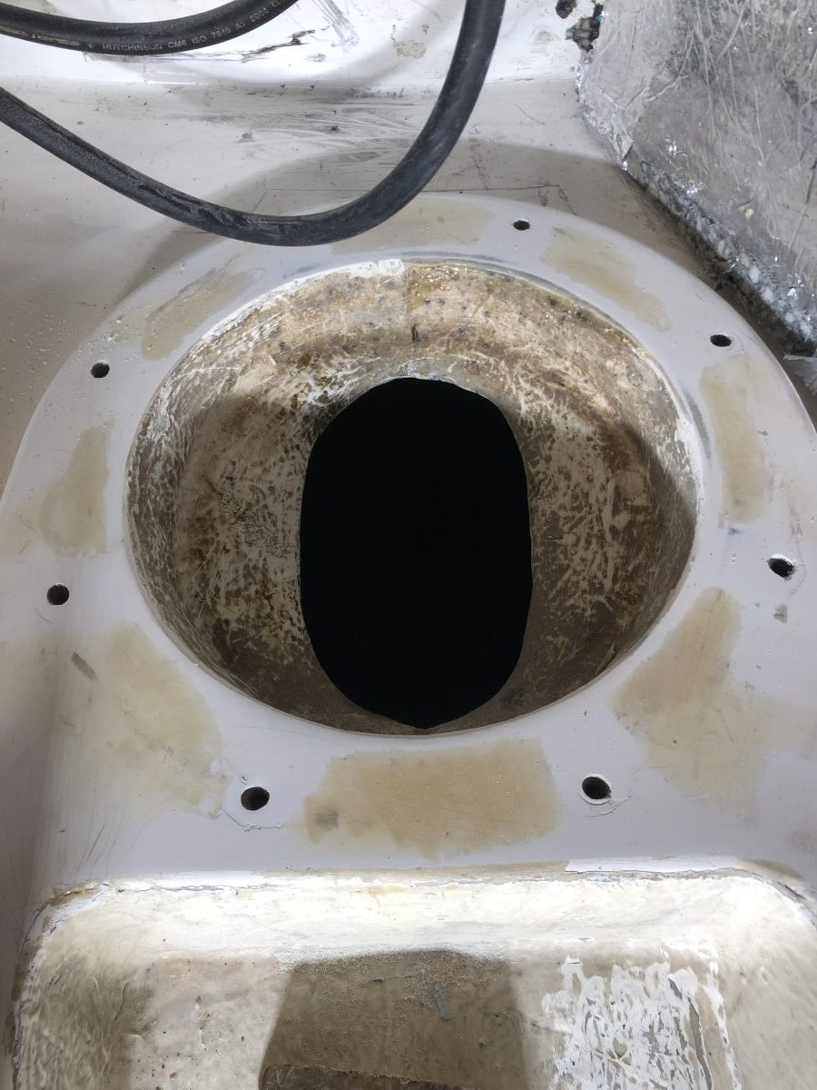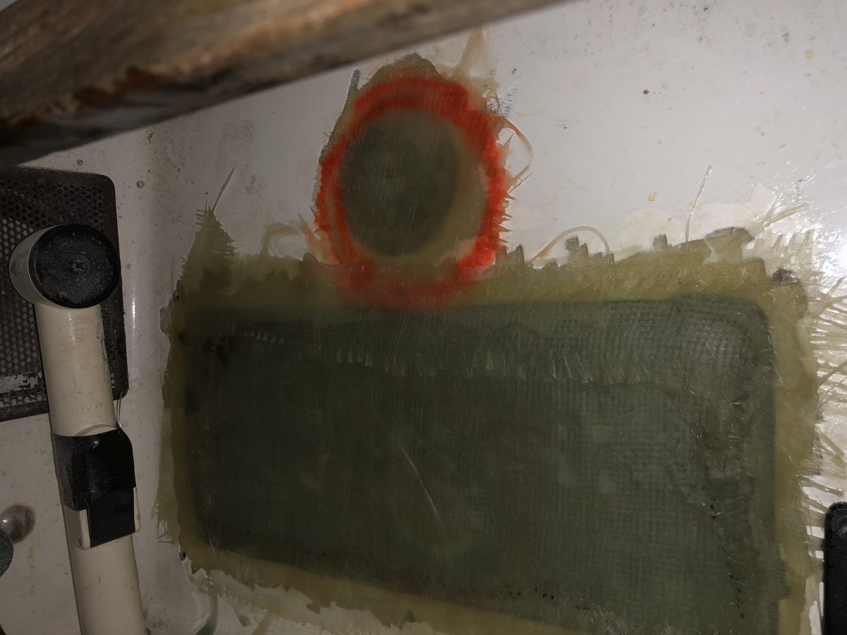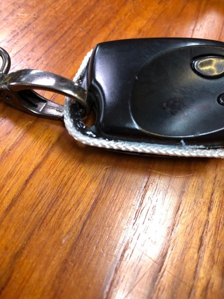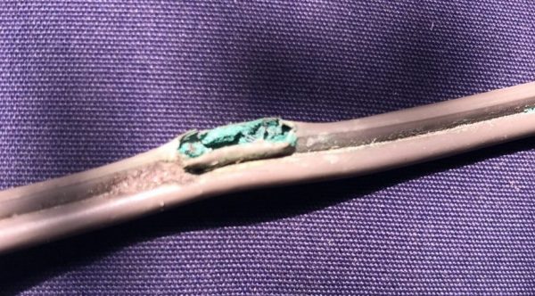 När masttoppsbeslaget var loss så var det ju lika bra att kontrollera trissorna för storfallen. Det såg ut som en ”rörsprint” satt genom hålet och lagrade trissorna. Sprinten satt inte helt i hålet på ena sidan och gick lätt att trycka ut med fingerkraft. Det visade sig när den kom ut att den spruckit på längden.