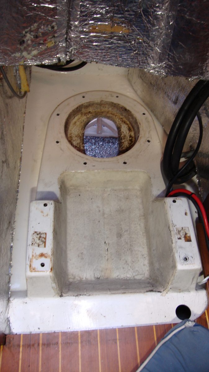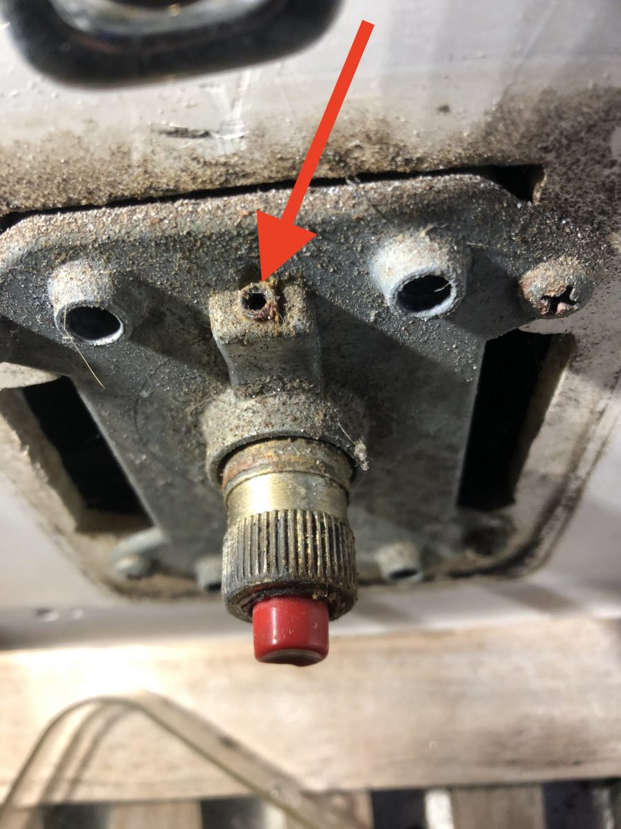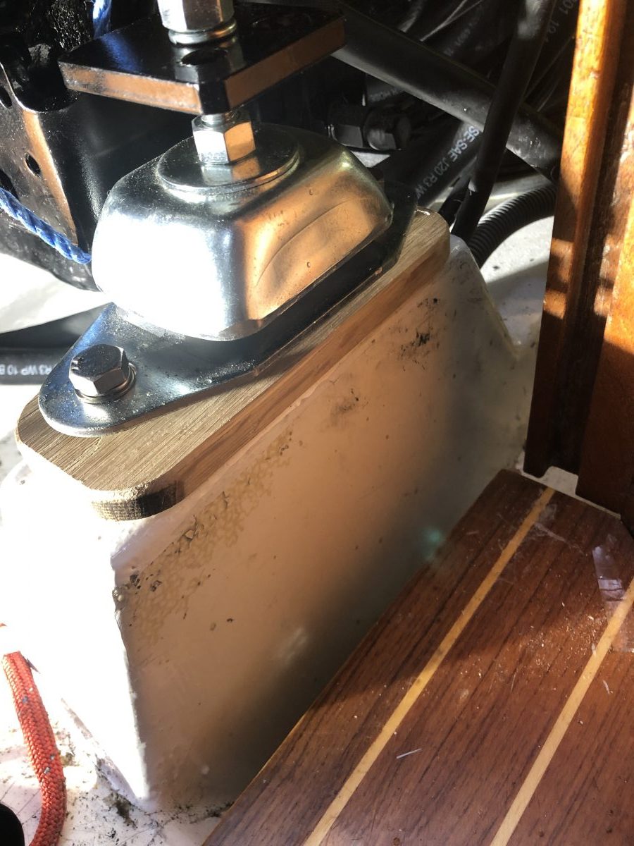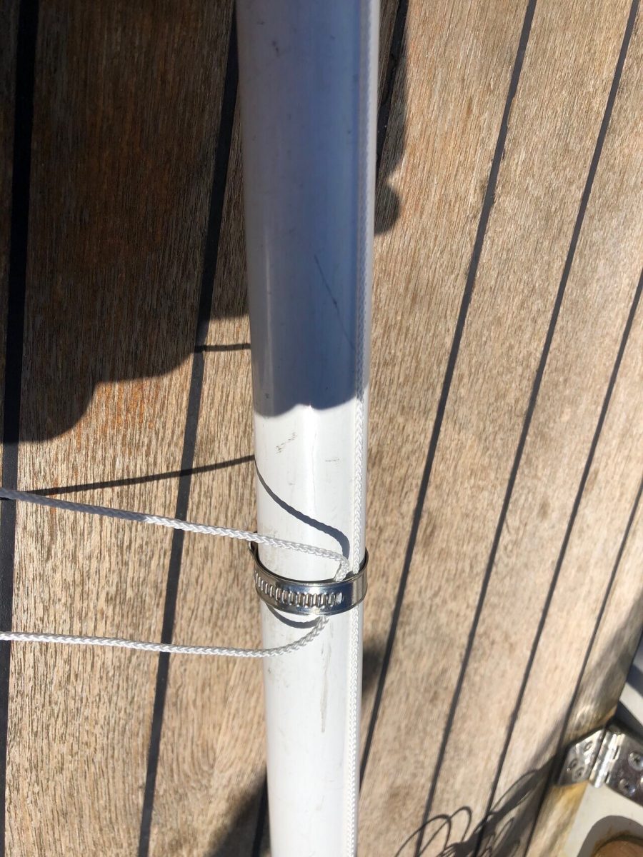 Detta beslag tar jag bort under vintern när masten ligger i mastskjulet. Skruvhålen för plåtskruvarna har blivit sämre och sämre och skruvarna sitter inte riktigt hårt. Oroande då inget i masttoppen får lossna under säsong/segling eftersom det är svårt att åtgärda.