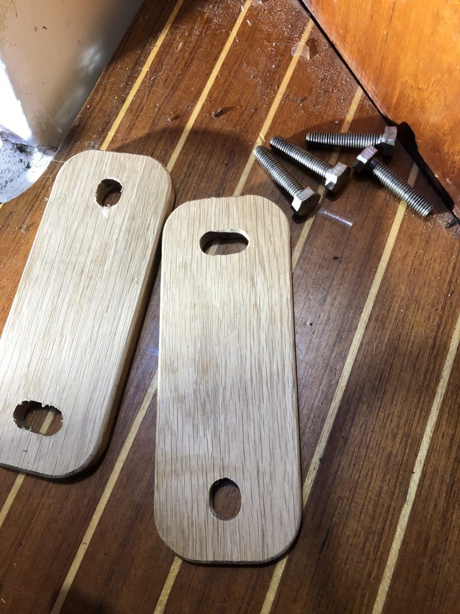 Nu fanns ett spår för den lilla sprinten som gör att riggbulten inte kan rotera utan trissorna kommer garanterat att snurra runt axeln. Riggbulten kapades i andra änden så att den blir exakt lika som bredden på masttoppsbeslaget.