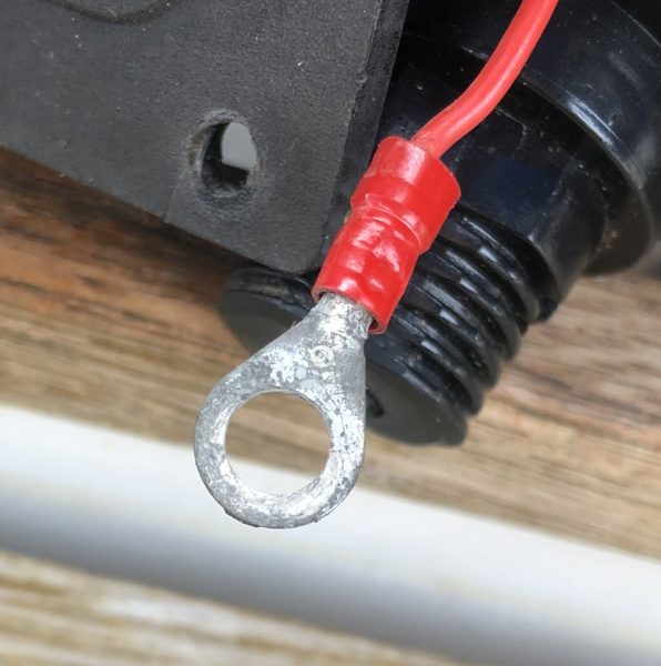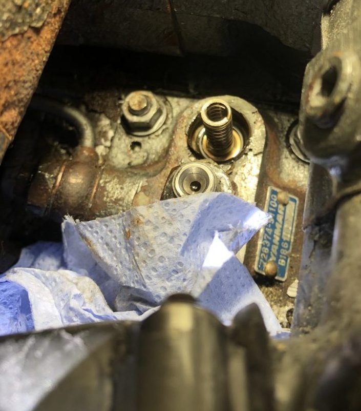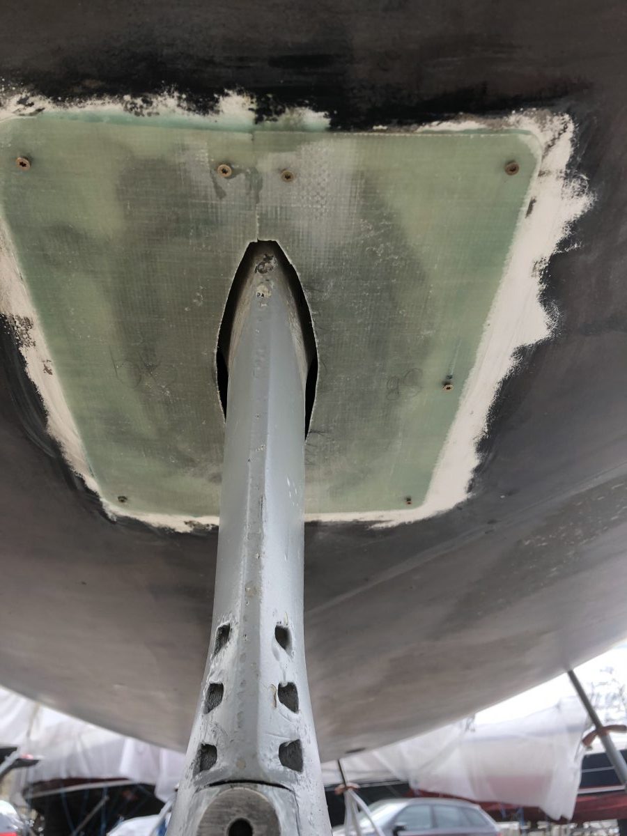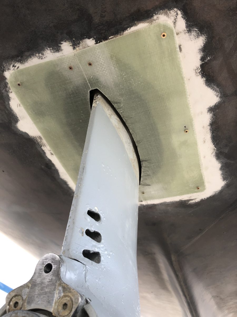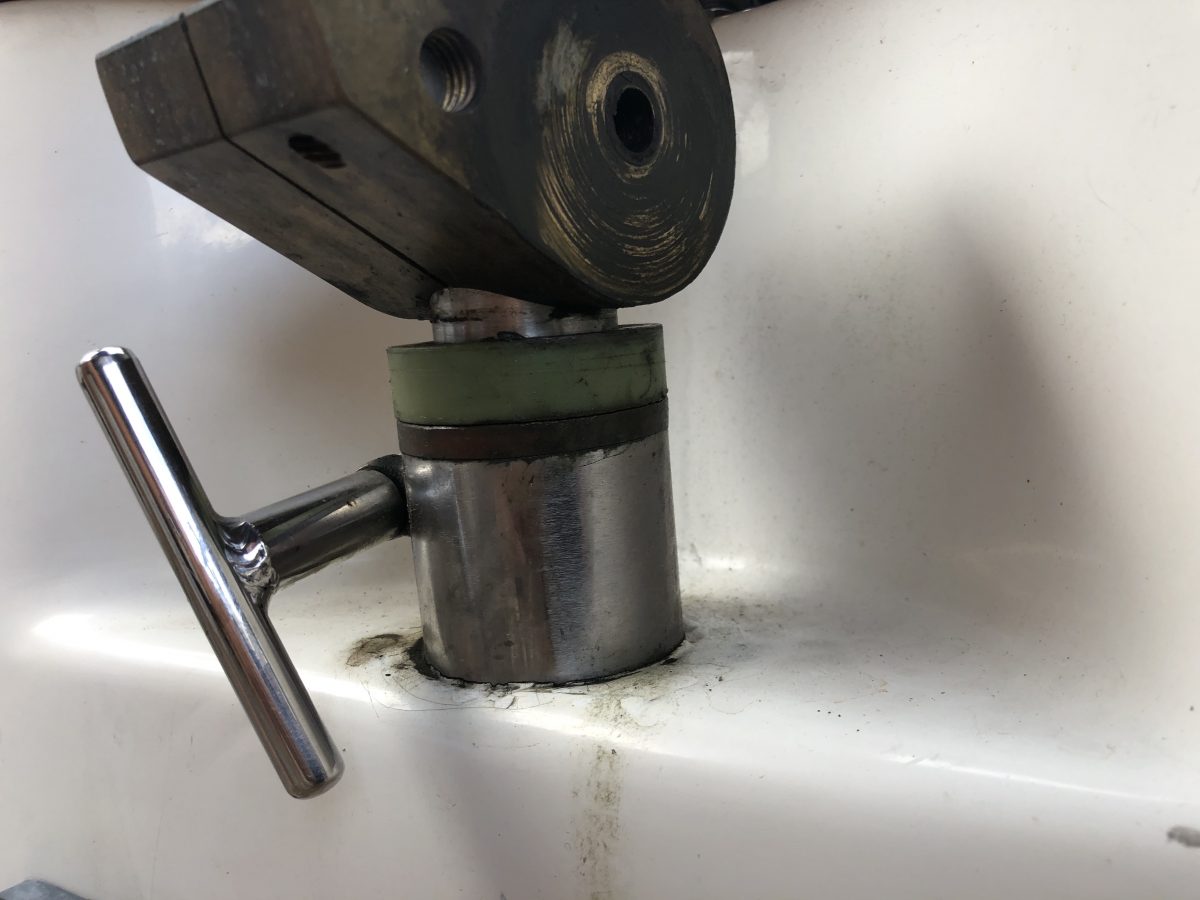 Därefter släpper jag på tampen som håller rodret uppe, skruvar dit rorkulten och nu vilar rodrets tyngd på kullagret.
