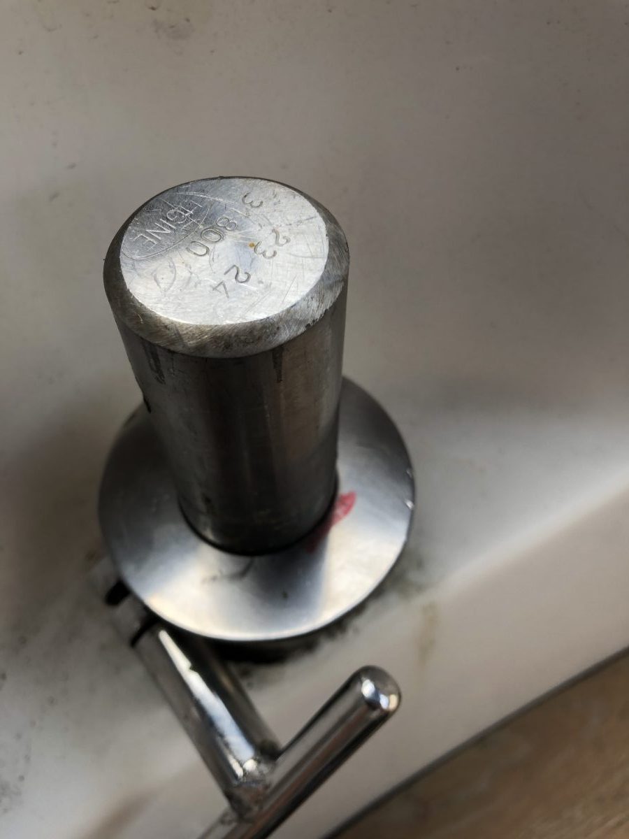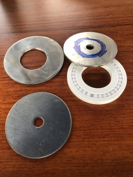 För att lagret skulle få ordentligt stöd så behövdes en rejäl bricka under, likaså brickor ovanpå som skall vila på kulorna. Det gröna lagret är 14mm högt och med det material jag hade i rostfritt kunde jag få ihop 14,5mm. En bricka tillverkade jag från en 3mm plåt. De andra brickorna var extremt stora 90mm med 10mm hål