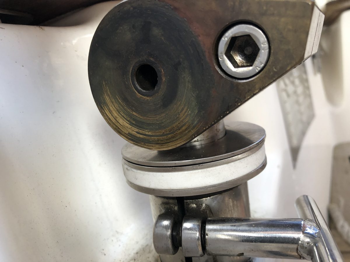 Och uppe på det två brickor och sedan återmontera klumpen. Man måste sätta i den tvärgående bulten och sedan dra åt insexskruven som klämmer fast klumpen för att sedan få dit rorkulten.