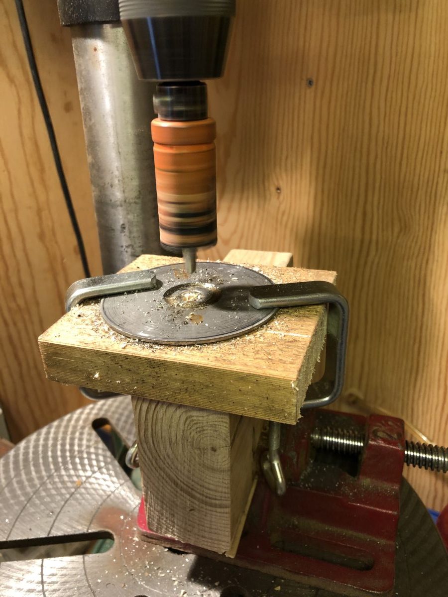 Det vart mycket arbete med hålsågar, filar och vinkelslipen. Det svåra var att borra ett större hål i centrum när inget styrde hålsågen.