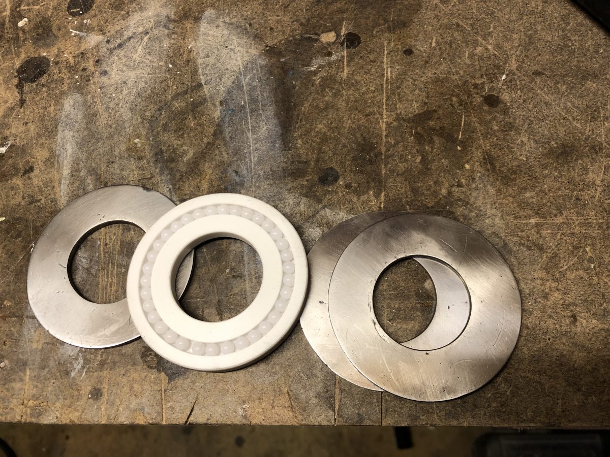 För att lagret skulle få ordentligt stöd så behövdes en rejäl bricka under, likaså brickor ovanpå som skall vila på kulorna. Det gröna lagret är 14mm högt och med det material jag hade i rostfritt kunde jag få ihop 14,5mm. En bricka tillverkade jag från en 3mm plåt. De andra brickorna var extremt stora 90mm med 10mm hål