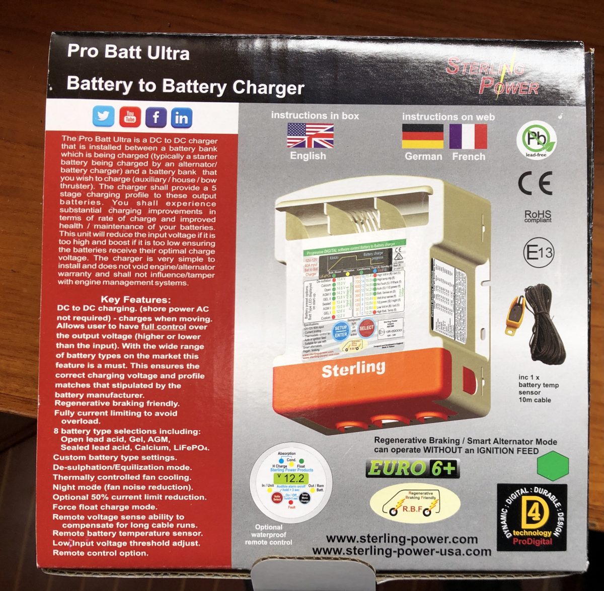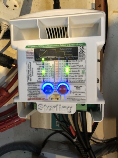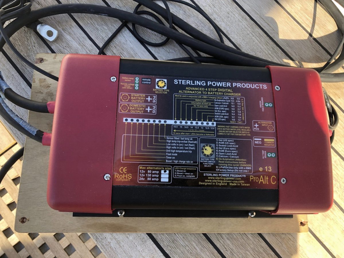 Jag funderade på att åter koppla in min Sterling Alternator-to-Battery-charger. Den kopplas mellan generatorn och batterierna. En ingång och två utgångar. Generator in och Stertbatteri och förbrukarbatterier. Den ger mycket mer laddning genom att ”lura” generatorn att batterierna är djupt urladdade. Därmed laddar generatorn mycket mer som laddaren sedan gör om till ”smart” laddning i flera steg.